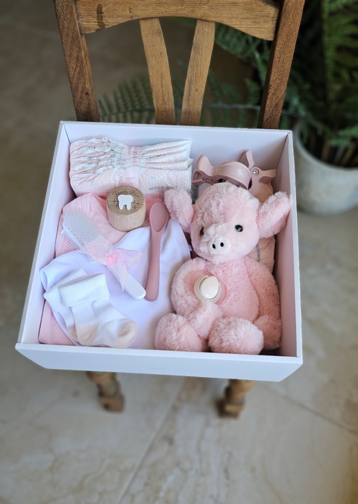 Thoughtfully curated for modern gifting, our Beige Boxed Nappy Hamper offers all the essentials you love in a traditional nappy hamper—beautifully presented in a sturdy gift box designed for easy, secure long-distance posting if required.